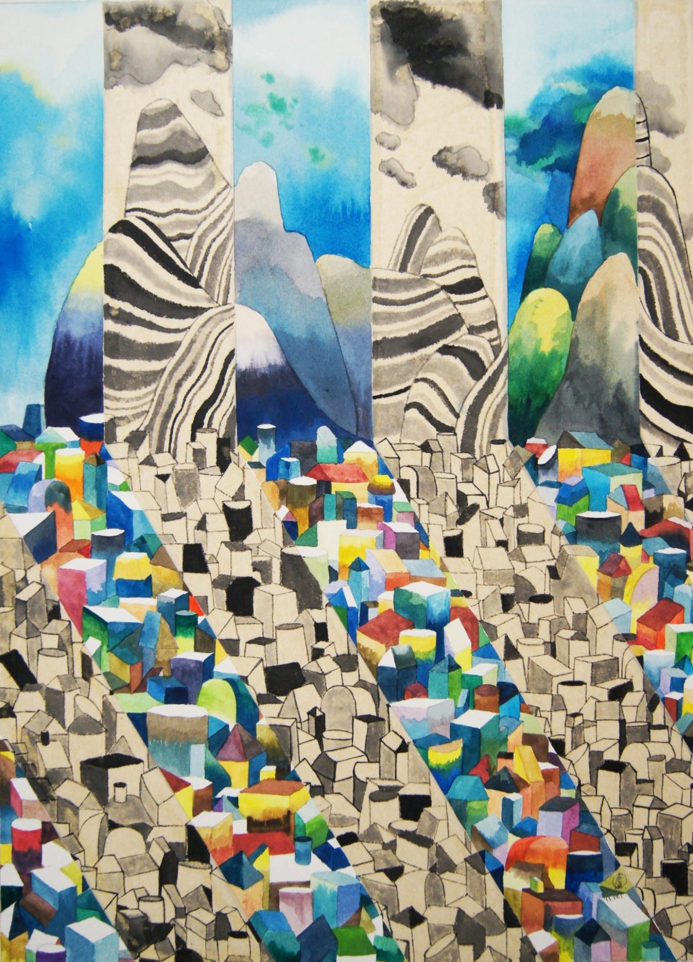 City in Stripes, Chinese ink and watercolour on paper, 42 x 30 cm, 2019. (Melbourne, Australia)