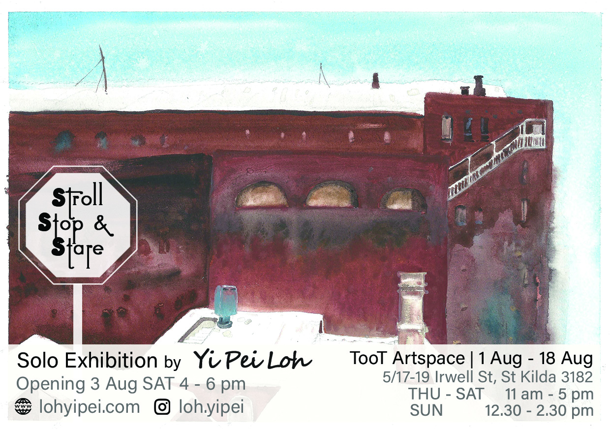 Stroll, Stop and Stare presents Yi Pei Loh’s art on paper depicting surrounding and everyday life of his living neighbourhood, St Kilda. By observing everyday objects, landscapes and architecture, the artist is inspired to create light-hearted and interesting art in different media. Yi Pei likes to strolls around in the neighbourhood and often surprised by the beauty of the common as well the extraordinary of local place. Those discoveries always inspire the artist with passing whims which eventually shape his works that see the interplay of the realistic and the fictional.