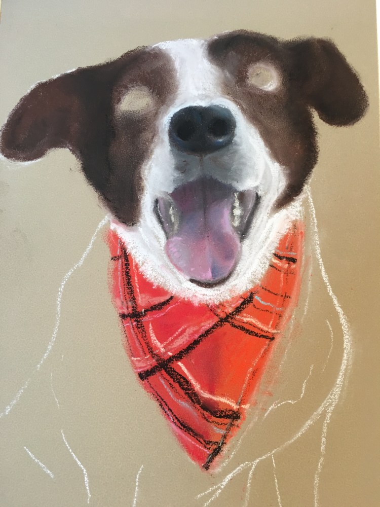 Pet portrait of a Dalmatian mixed, hand-drawn with soft pastel on coloured-paper.