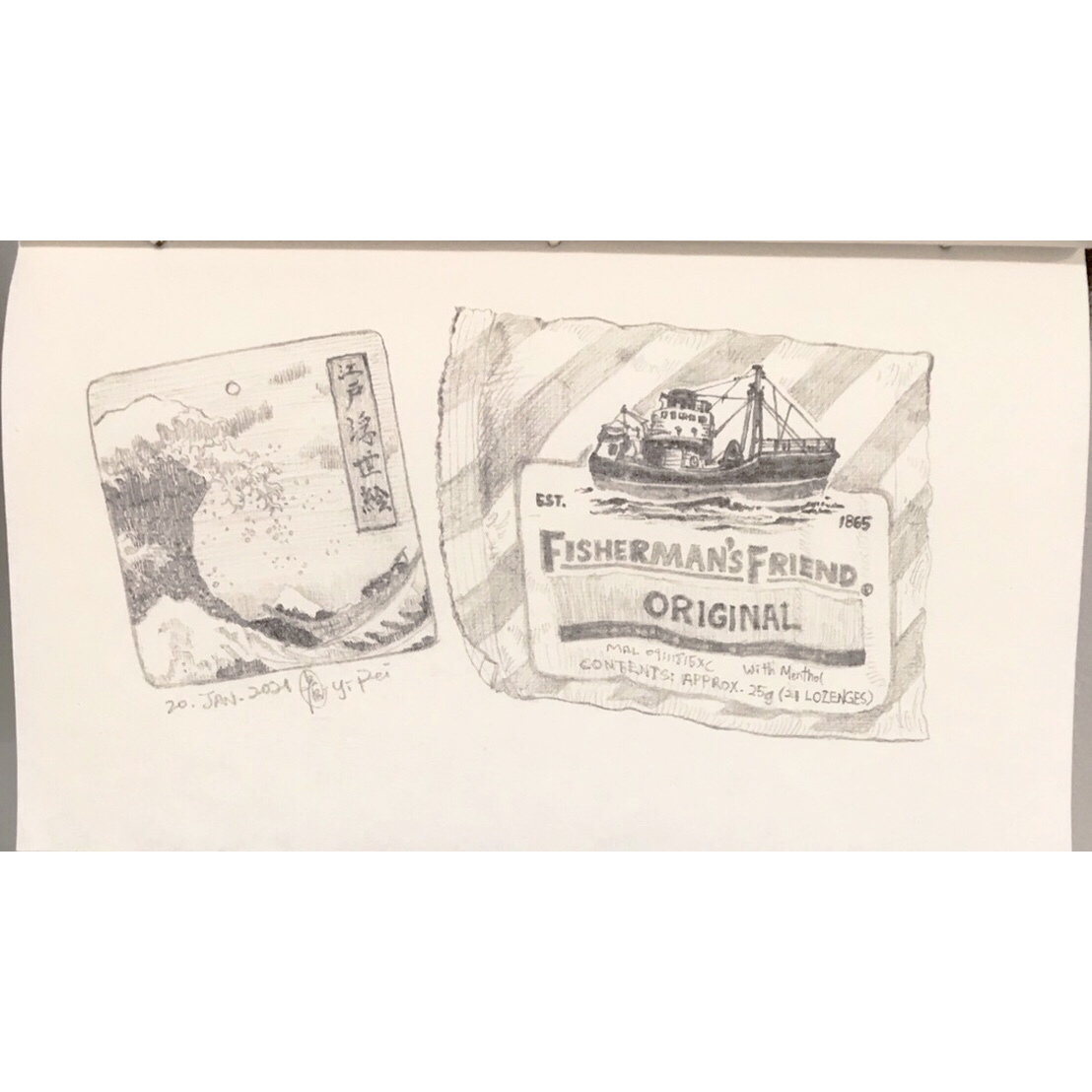 A t-shirt label from Uniqlo (image by Katsushika Hokusai) and a pack of Fisherman’s Friend lozenges…. somehow related.. a little bit, I guess…