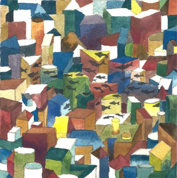 City with Painted Nature, watercolour on paper, 10.5 x 10.5 cm, 2019. (Melbourne, Australia) (SOLD)